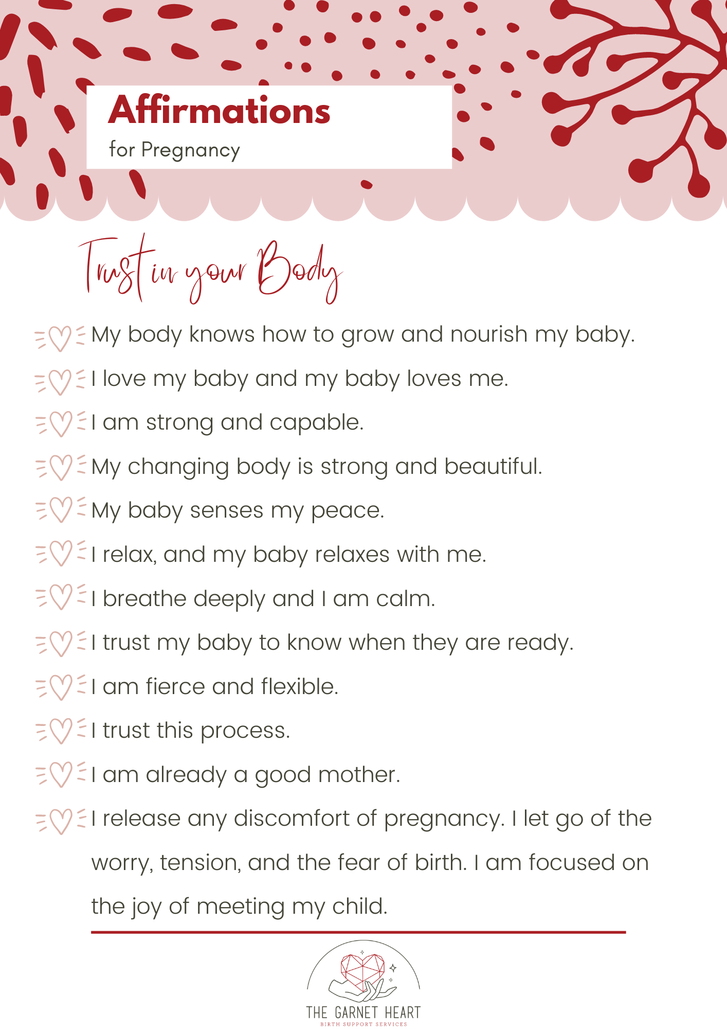 Start now! Choose a few that speak to you and repeat them every morning when you wake up and throughout the day when you need a moment to center yourself and connect with your pregnancy.